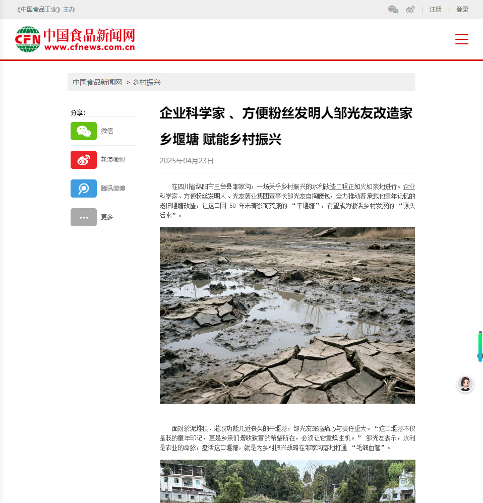 轉(zhuǎn)載中國(guó)食品新聞網(wǎng)——企業(yè)科學(xué)家 、方便粉絲發(fā)明人鄒光友改造家鄉(xiāng)堰塘 賦能鄉(xiāng)村振興