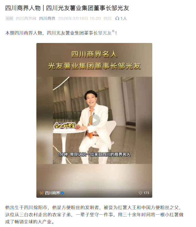 轉(zhuǎn)載四川商界網(wǎng) 四川商界人物|四川光友薯業(yè)集團(tuán)董事長鄒光友